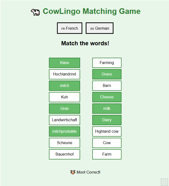 This is a fun Game which teaches you German and French using cows. It currently has 9 words in both French and German: Cheese, Milk, Cow, Farm, Farming, Barn, dairy, Highland Cow and Grass however we are planning to add more in the future!